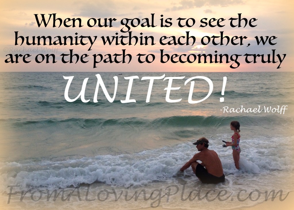 If I’m triggered with fear, anger, rage, or hate, I see what parts of me I need to spend time with to heal, so that I don’t project my darkness out to the world and hurt someone else. I don’t ALWAYS do this perfectly, because that is not what the human experience is about. The human experience is about learning. How can I learn if I’m not willing to listen? So, even in my differences with others who want to live from a fear-based place, I still can find a place to unite, grow, and learn. I cannot unite the world, but I can feel united with the world, and I do.