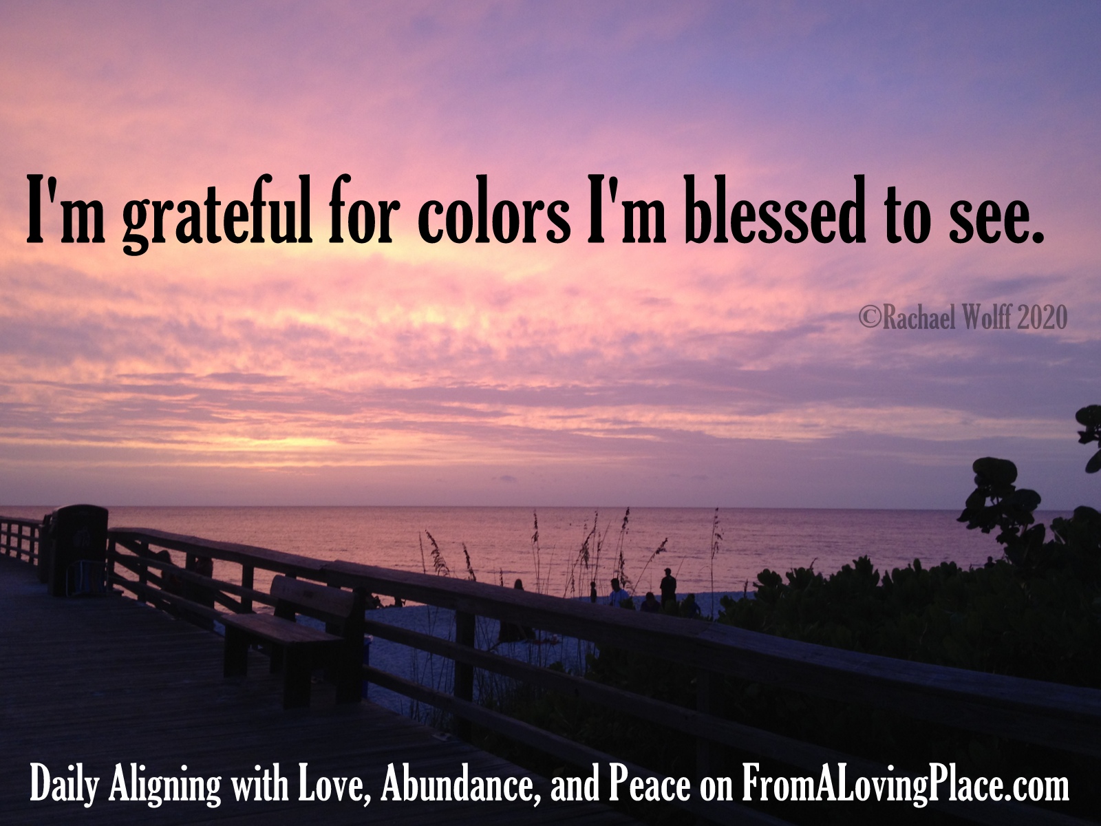 If we take a second to really think about colors, they are so important. I’m grateful for colors in so many ways. Whether it be the color of a person’s skin, a beautiful sunrise or sunset, flowers, plants, trees, and the list goes on an on. Seeing color, seeing the person or moment in front … Continue reading Daily Aligning with Love, Abundance, and Peace #27