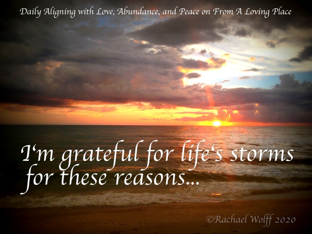 When I’m caught up in my own storms, I’ve learned to find gratitude to help me re-align my energy. Life is not always going to be pretty. The storms are out of our control. We don’t HAVE to align with love, abundance, and peace in the storm, during, or after the storm—some won’t. Realizing it’s not about what anyone else chooses to do that makes us appreciate the storms, it’s about what energy we choose to feed: love, abundance, and peace or fear, lack, and separation. The choice is ALWAYS ours. How you interpret life’s storms is your business. I will choose to stay in gratitude for all the amazing lessons I learn in this journey of life.