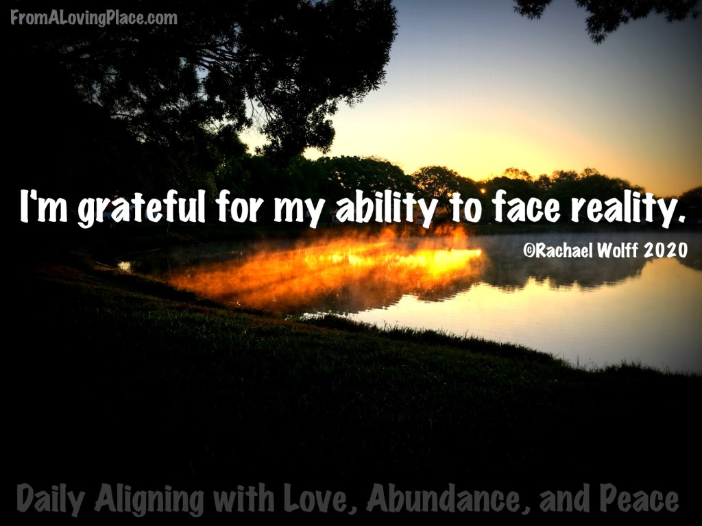 I’m grateful for my ability to face reality. Here’s where the power of our perspectives really comes into play. How we look at what is in front of us, can make us or break us. Our perspectives on the reality we are facing will make us a victim, or it will empower us to be our best selves. Byron Katies says, “When we we fight reality, we lose 100% of the time.” If we want to live empowered lives aligned with love, abundance, and peace, we have to face the reality in front of us. I’m grateful I have the tools to do that. What happens outside of us doesn’t matter as much as what happens inside of us. Whatever the reality is in this moment, I will face it head on and find ways to shine my light. When I face reality, I empower myself to do the best I can in the moment. If I need to meditate, I meditate. If I need to write perspectives out until one brings me peace, that is what I do. I can only be the change if I’m living the change within me. Everything I’ve ever experienced has helped to mold me into the person I am in this moment. There was a lot of ugliness in my past. It taught me to embrace my reality whatever it looks like in the moment and learn as much as I can from the experience. I’m not going to say it was easy, or that I wasn’t praying on regular basis for guidance on what to do. I stopped fighting reality, because it just doesn’t serve me or anyone else when I resist what is.