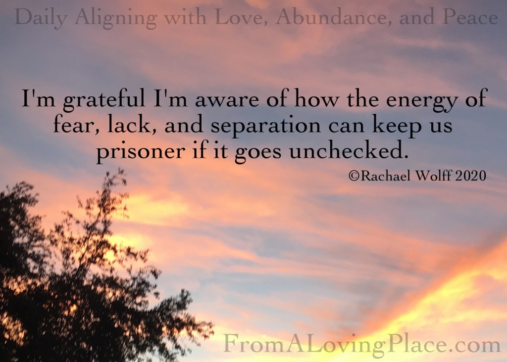 I’m grateful I’m aware of how the energy of fear, lack, and separation can keep us prisoner if it goes unchecked. When we feel like a prisoner in the outside world, it’s because we are a prisoner of our own inner world. Whatever is going on inside us, reflects back to us in the world outside of us. We will see through lenses of fear, lack, and separation or love, abundance and peace depending on which energy we are feeding IN THE MOMENT! When people ask me about what I see right now, I see how the energy of fear, lack, and separation has manifested itself in the world. I see how people who are being driven by the energy of love, abundance, and peace are rising up. I also see how some people are unwilling to look at the energy of fear, lack, and separation within themselves and mistake the energy of fear for love, lack for abundance, and separation for peace.