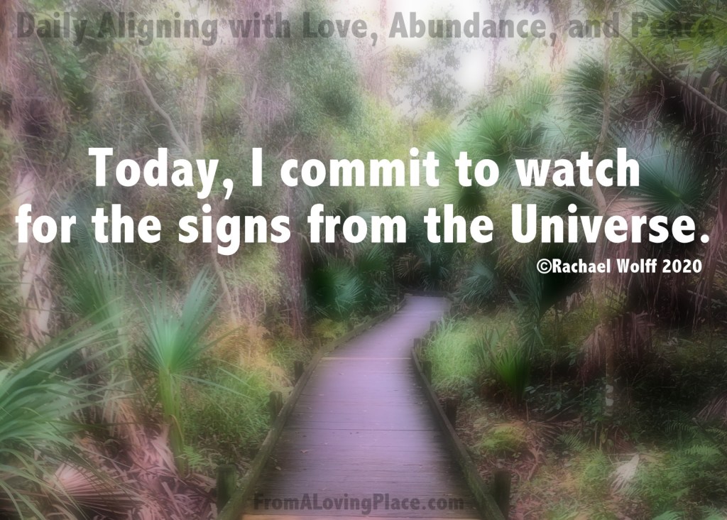 Today, I commit to watch for the signs from the Universe. Here’s what I know, when I’m open and willing to listen—the signs are there! The signs give me momentum to take the next step on my unknown journey. When I’m listening, no matter what happens, I feel safe in the knowing that everything is as it should be. The more aligned I am with love, abundance, and peace the more I can embrace what is in front of me. It all works together.