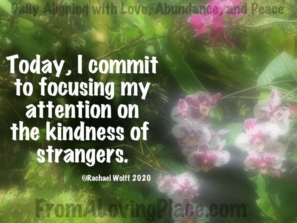 Today, I commit to focusing my attention on the kindness of strangers. Wherever we put our focus, we will see more of. If we are looking for kindness in the world, we will see all kinds of acts of kindness. We don’t even have to leave our house to see it. All we have to do is search acts of kindness on the internet. I guarantee your heart will be filled just watching and reading the stories. If we want to stop contributing to the fear, lack, and separation, we have to put our energy where our love, abundance, and peace GROW. Paying attention to the kindness of strangers reminds me of how many people do care, do show up, and do want to create a positive change in the world. Stay present, stay KIND!