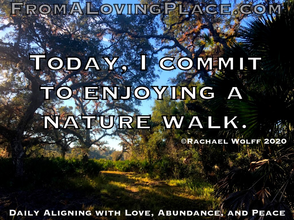 Today, I commit to enjoying a nature walk. This morning I’m looking forward to taking a walk just as the sun starts to warm the Earth. The beautiful thing about a walk is it doesn’t have to be long to have positive effects on us. As much as I love spending hours in the woods, I also love walking around our small community lake and watching all the birds gathering on their island and around the edges of the lake. I love hearing all their calls. I remember when I lived up North doing short winter walks especially after it snowed so that I could feel the snow crunching beneath my feet. Do you know all the walking places in your area? I keep discovering new ones around me. I’m amazed that there always seems to be more. I love tapping into the energy of peace by spending time walking in nature.