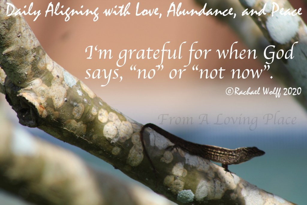 I’m grateful for when God says, “no” or “not now.” I used to believe I had all the answers. I would make myself crazy with expectations of the way I thought things SHOULD go 24/7. Each day would end and I would be disappointed in all the things that didn’t go they way I thought they SHOULD. Does this sound familiar to you? This perspective of belief kept me in the energy of fear, lack, and separation. When I started to understand that there is a greater wisdom out there and it sees the big picture that I don’t, I opened myself up to the possibility that there was a reason for “no” and “not now.” Looking back at the times a prayer’s answer was, no or not now—I’m grateful. Years ago, I read a book by Robert Ohotto, which I’ve talked about on this blog before. He talked about “ego prayers” vs. “soul prayers”. The examples changed the way I prayed, and received my answers. It’s funny, because I couldn’t tell you anything else about the book, but that one section was life changing for me. In the book he used letters as someone praying, and God answering to both the “soul prayer” and the “ego prayer’.