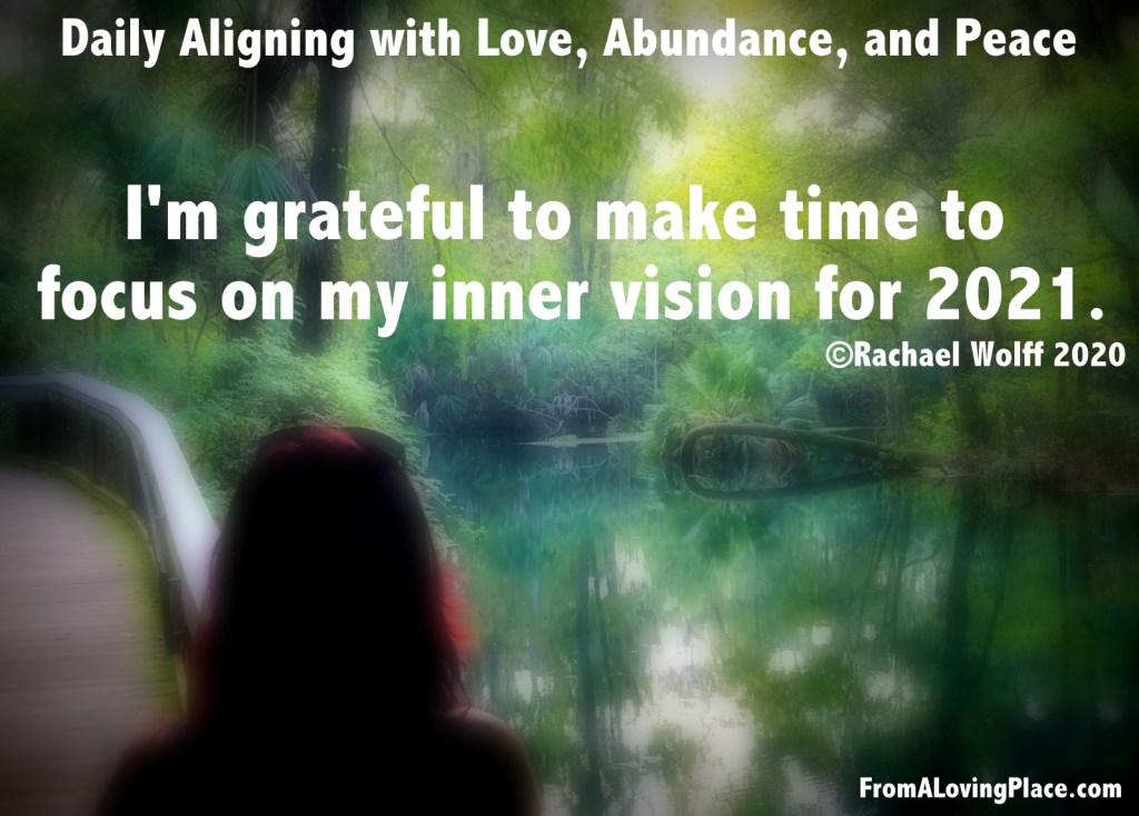 I’m grateful to make time to focus on my inner vision for 2021. Yesterday, I started this process by making the time to take care of my needs and seeing what work I still needed to do. Today, I’m so grateful to make the time to focus my energy on my inner vision for 2021. If 2020 talk me anything, it’s that I have NO IDEA what is coming. Many of us have had to work through some major challenges this last year that we personally had no control over. That is why this year, my goals are all aligned with what I feed and create within me. That way the outside world doesn’t have the ability to keep me from accomplishing anything I set my mind to. My inner vision about what I am projecting out to the world, which I DO have control over. I’m so grateful that my worth doesn’t have anything to do with the chaos going on in the world. What is important is that I’m clear on MY inner vision, so that I have the ability to stay aligned with love, abundance, and peace no matter what is going on around me.