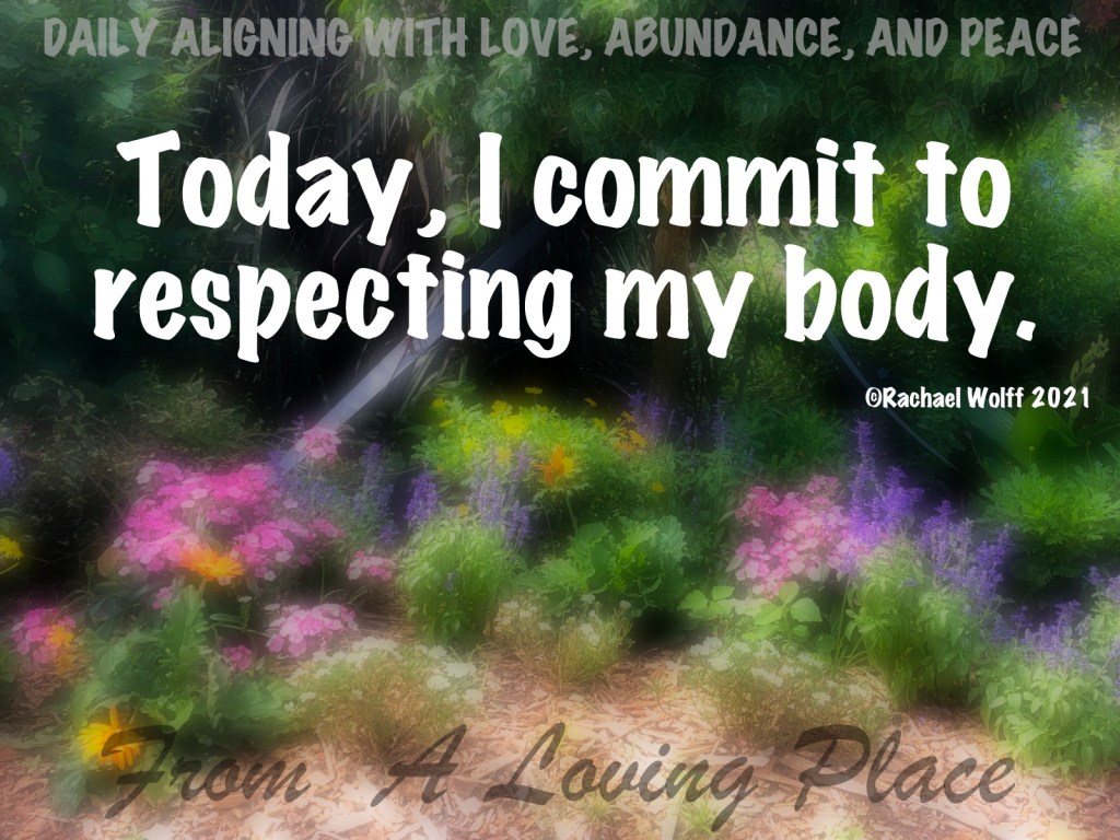 These are just initial thoughts of things I can do. It doesn’t mean I will do them all. I just know the more respect I show my body, the better I feel. The better I feel, the better I treat myself. The better I treat myself, the better I treat others. The better I treat others, the faster the world changes in a positive direction… these are patterns of thoughts and behaviors I can get behind! These are the things that keep me aligned with the energy of love, abundance, and peace.