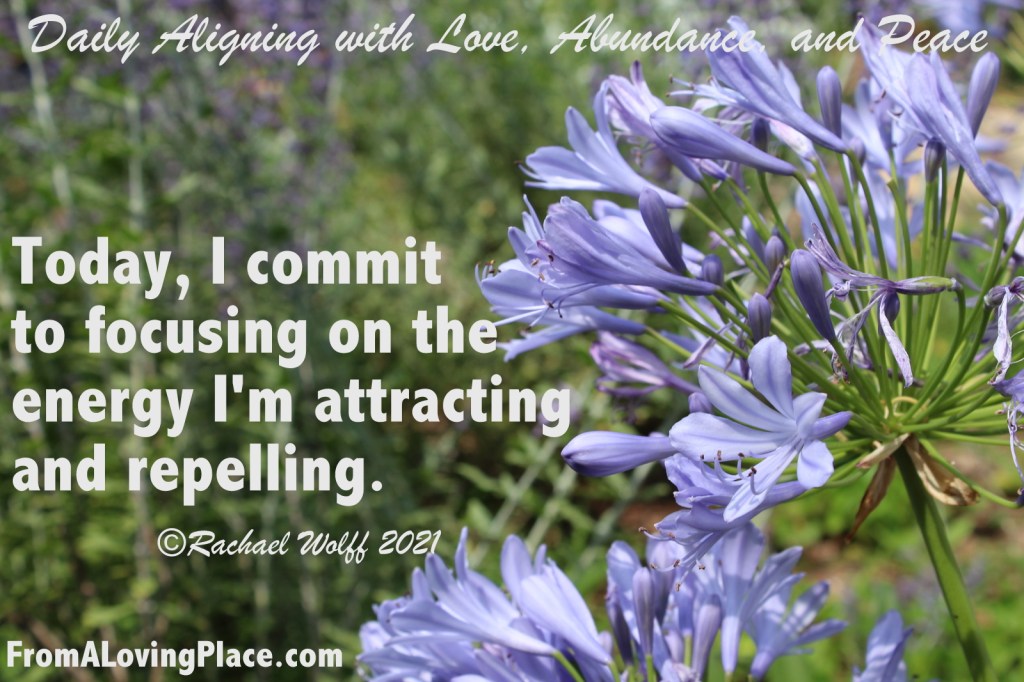 Today, I commit to focusing on the energy I’m attracting and repelling. This takes being completely present. I find that having a clear understanding of the energy fields of love, abundance, and peace and fear, lack, and separation are helpful. The more I understand these two groups, the more clearly I see when I’m attracting and repelling—AND what that means about where my energy is. This tool keeps me responsible and accountable for the energy I’m putting out there. It also helps me to be honest with myself, because energy doesn’t lie. There is no one I can blame or give credit to for my energy being where it is. Can people influence my energy? Only if I allow them to. I’ve given myself excuses a millions of times on giving others blame or credit, but the truth is if I didn’t want to be in an energy field, I wouldn’t be there. I’m the one who has to figure out what will help me get out of it, but nobody can do that part for me. They can nurture and support or attack and push buttons, but they can’t MAKE me shift.