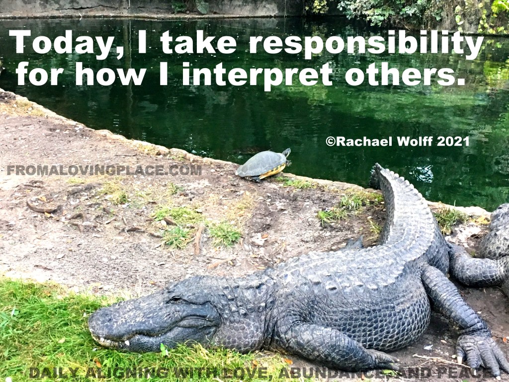 Today, I take responsibility for how I interpret others. Are my thoughts of others getting in my way of aligning with love, abundance, and peace? That is the question I ask myself when I’m getting pulled into the chaos of someone else’s story. I can make positive changes in the world without hating a person who has wronged others. All that hate does is taint my energy. Why would I want someone who has wronged others to have that power of me? How I interpret someone else is less about them and more about the energy I’m putting into the story I make up about them in my head. If it’s in my head, it affects my energy. I’m responsible and accountable for the energy I carry. If I want to live in the energy of love, abundance, and peace I have to do the work to keep my energy there.