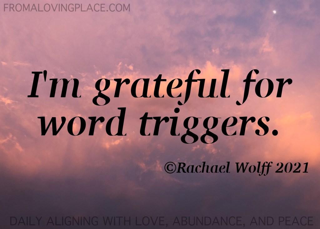 I’m grateful for word triggers. On Day #266 (click on number to read post), I went deep into the healing potential from emotional triggers. I mentioned a recent experience of going on a very quick healing journey from a word trigger. I’m still in the state of AWE from that experience. It was probably my fastest healing experience I’ve had so far. That is why I’m feeling a calling to go deeper into the journey of healing through triggers with you here. The next couple days will be full of helpful tools I’m using to free myself from those places that still hold attachments to the energy of fear, lack, and separation. Today, is all about the power I give to words.