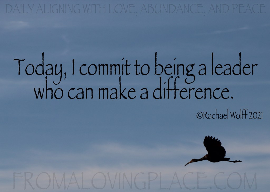 Today, I commit to being a leader who can make a difference. I do what I do because I know it makes a difference in the world. I know the more people who see their own power to create from the energy of love, abundance, and peace, the better. I love doing this blog because people can pick it up at any time and on any day and have a way to align with the energy of love, abundance, and peace. I also pave the way on FromALovingPlace.com and Facebook.com/FromALovingplace for people to choose love over fear, abundance over lack, and peace over separation. I know the impact of living from a loving place, and I do my best to be the example of it every chance I get.