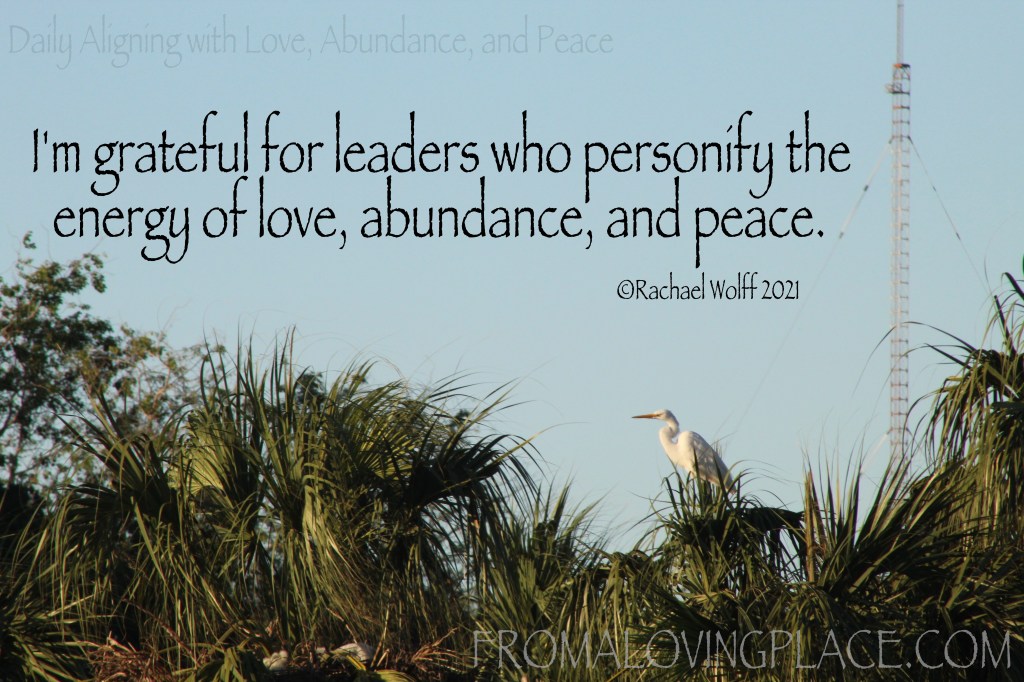 When I say I’m grateful for the leaders who personify the energy of love, abundance, and peace, I’m admiring the leaders who have found their calling. When someone is following the calling of their soul, I FEEL it. A person’s passion, combined with the energy of love, abundance, and peace is like a cell phone tower. The energy spreads far and it permeates into the very heartbeat of humanity.