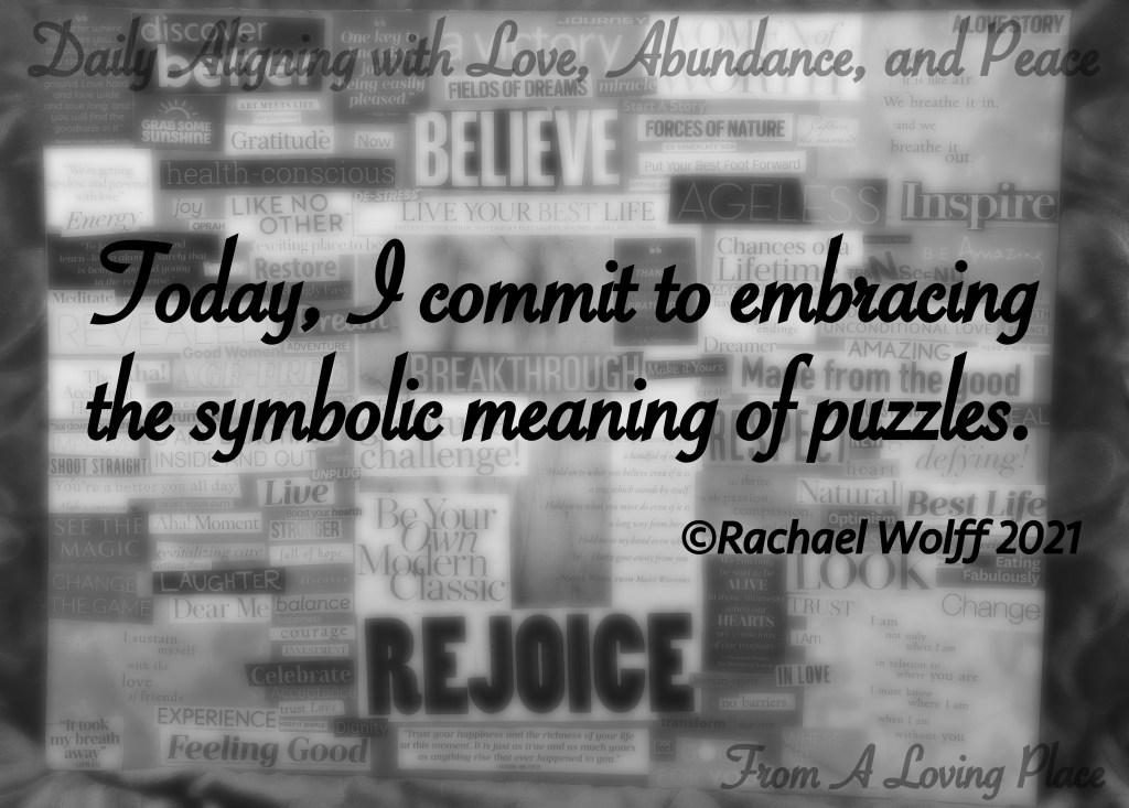 Today, I commit to embracing the symbolic meaning of puzzles. The image below is one of the ways I see my own personal puzzles. I create what some people call vision boards to help remind me of what I want out of my life. They are me doing something physical to put the puzzle pieces together in a way that makes sense to me. It’s like looking at the full image on a puzzle box, but the puzzle still needs to be put together. One of my boards even has puzzle pieces right on it. I also have a five-gallon bucket with pictures of Sedona, Arizona on it. I made that over a decade ago in hopes of getting back out there because I knew intuitively, I had more to figure out there. I made it back to Sedona a few years ago, which is where the book I was about to write was revealed to me. Just pieces fitting together.