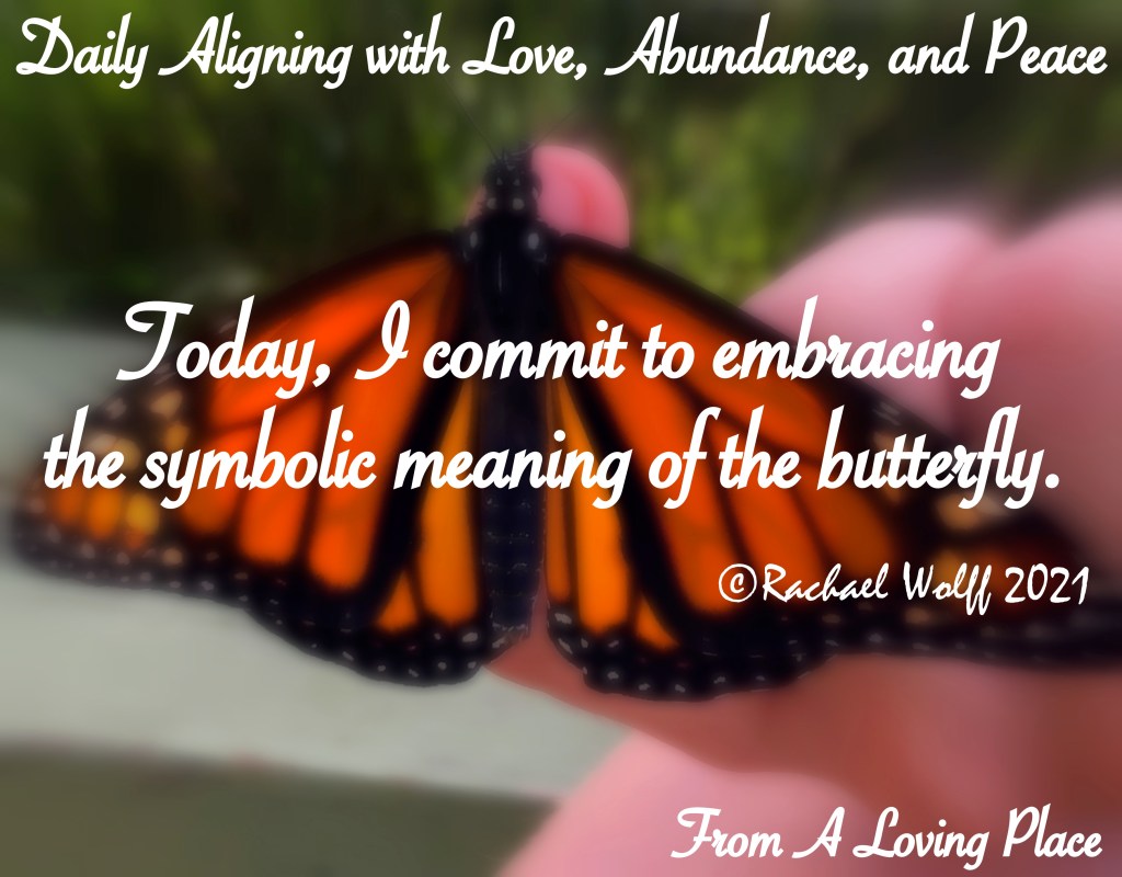 Today, I commit to embracing the symbolic meaning of the butterfly. I’ve been sitting in the stillness of the chrysalis for some time now. I’m taking in so much by being in this part of my butterfly journey. Much of the work I’m doing is what happens within the chrysalis. The caterpillar becomes mush in the chrysalis. Then puts itself back together in a different and more brilliant way. This is where the struggle of the caterpillar begins to make sense. My journey of Daily Aligning with Love, Abundance, and Peace has been about putting all the pieces together to make sense. I know there is much more to come, but I’m enjoying this journey EVERY step of the way. I honestly am amazed at how my life has changed since I started writing this series 287 days ago.