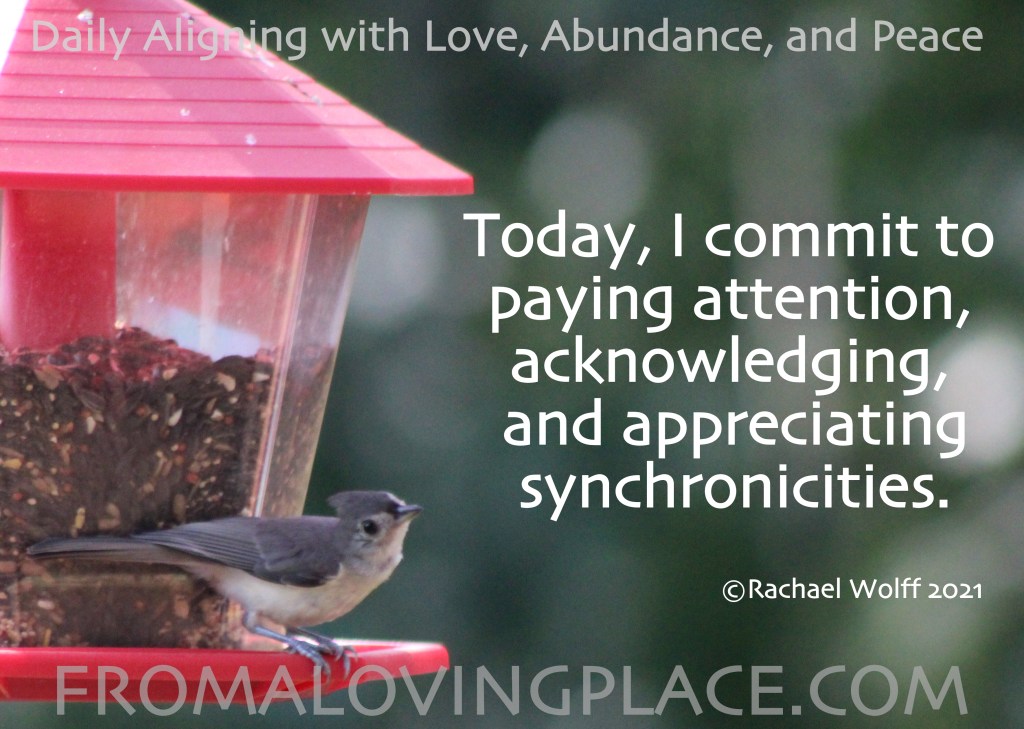 Today, I commit to paying attention, acknowledging, and appreciating for synchronicities. One of the most amazing tools I’ve learned is to be grateful as if I’ve already experienced what I’m asking for. I only can see what I’m already projecting out, so if I believe that synchronicities will be revealed to me daily and am grateful for that, I notice them more because I already know they are there. I just have to notice them. Since I believe in Divine timing, these synchronicities are a reminder that I’m covered. Everything is happening in perfect timing. Everything will be revealed exactly when it’s meant to be. I just have to be open to see, give, and/or receive it when it is presented to me. That is my free will. People, money, instructions, experiences, adventures, and opportunities ALWAYS come, but am I open enough to see and appreciate these things to recognize the amazing synchronicities that lead up to each one? That is what I’m working on.