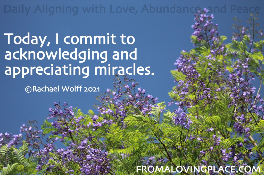 Today, I commit to acknowledging and appreciating miracles. We are shown only what we are open to see. I will start by setting my intention to stay open to see them. Next, I will say a prayer to help me align my energy with the feeling that comes from seeing and appreciating the experience of a miracle: