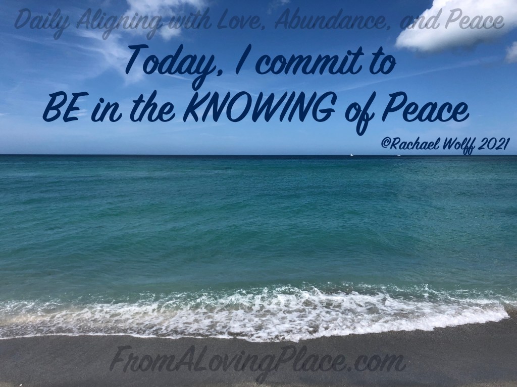 Today, I commit to BE in the KNOWING of peace. I love the feeling of peace. When I’m out of the present moment, I sometimes forget how easy it is to get back to peace. I’m not talking about sustaining the energy, just BEING in the KNOWING of peace in the next moment I’m given. I sometimes graze over how many peaceful moments I have in a day. Why put energy into moments I don’t feel peaceful? I want to BE in the KNOWING of peace, because whatever I focus on expands. The simply act of clearing the mind is knowing what it means to BE at peace. BEING in the KNOWING of peace doesn’t have to be anymore complicated than being present for a few deep breaths in and out. The more I practice BEING peace, the more peace I will be able to project out to the world.