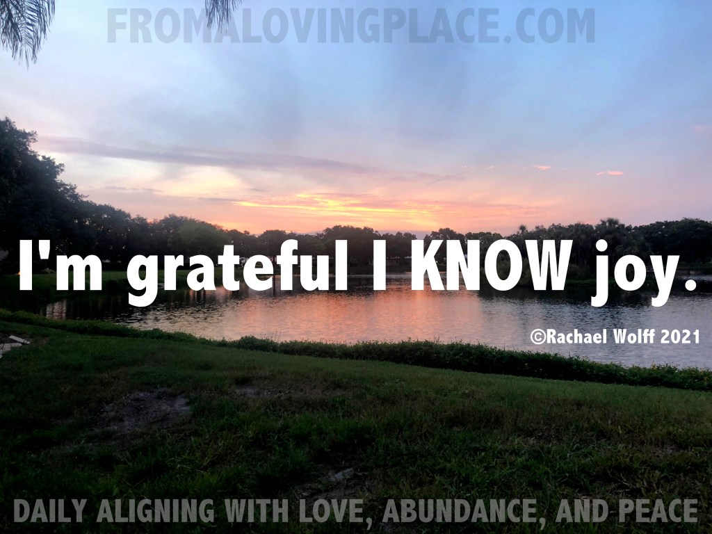 I’m grateful that I KNOW joy. The feeling of authentic joy is one of the best feelings. Joy happens when my energy is aligned with love, abundance, and peace in the present moment. If I am completely aligned, I AM JOY in that moment. I AM one with everything. This feeling may only last one moment or a string of consecutive moments, but knowing it when it happens is a magic moment. I find this to be the best time to create a vision for myself and send good energy out to others. Taking action from this space leads to healthy wholehearted decision-making.
