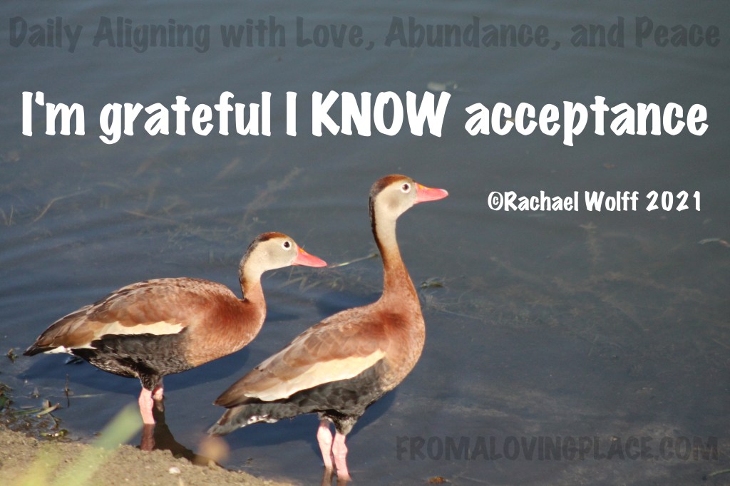 I’m grateful I KNOW acceptance. Acceptance for me is in the exhale. When I’m in fear of the unknown future or holding onto the story of something from my past (even if the past was two minutes ago), I hold my breath. When I consciously exhale, I’m releasing all of it to what is in this moment and I feel peace…at least for the moment. Sometimes it takes more work to get me into the energy of acceptance, but when I’m there, I’m calm. Accepting what is empowers me to do something about my circumstances, but putting my focus on what should have, could have, and would have keeps me trapped in the vicious cycle of a toxic story. KNOWING acceptance can keep me from wasting my energy on what isn’t. It also helps me when I start spinning the stories to take that breath and ask myself why I’m aligning with the energy of fear, lack, and separation. Any time I’m not accepting what is, I’m living in lack. I much prefer to live in abundance.