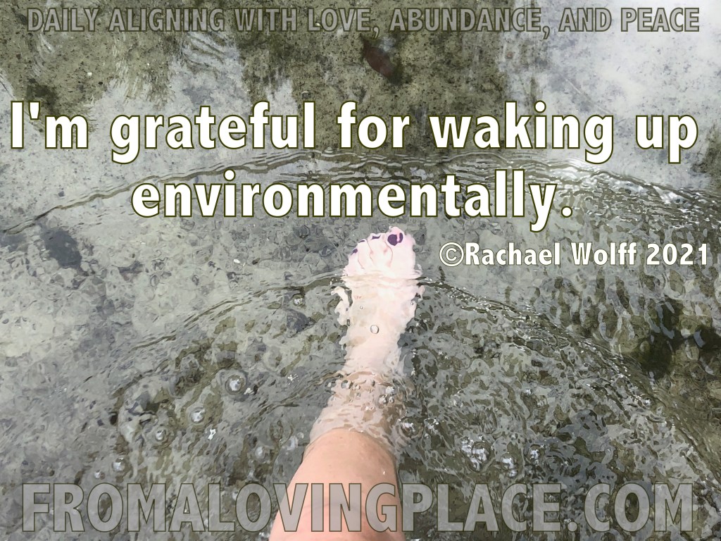 I’m grateful for waking up environmentally. There are many kinds of healthy and unhealthy environments. Living in an environment filled with lots of love, faith, trust, respect, healthy foods, clean air, safe neighborhoods, healthy spiritual practices, access to education, access to health & wellness facilities, support groups, and financial abundance (this does not just mean money, but living in abundance vs. lack) is going to have positive affects on our well-being. Living in an environment with a lot of tension, fighting, drinking, drugs, desparation, financial problems, limited health services, neglect, abuse, pollution, crime, violence, condemnation, judgment, and addictions is going to have negative affects on our well-being if we don’t have healthy environments to turn to in order to help us find our ways out. I’m so grateful I learned to see what were healthy environments to be in and what were not. My life is so much richer for it!