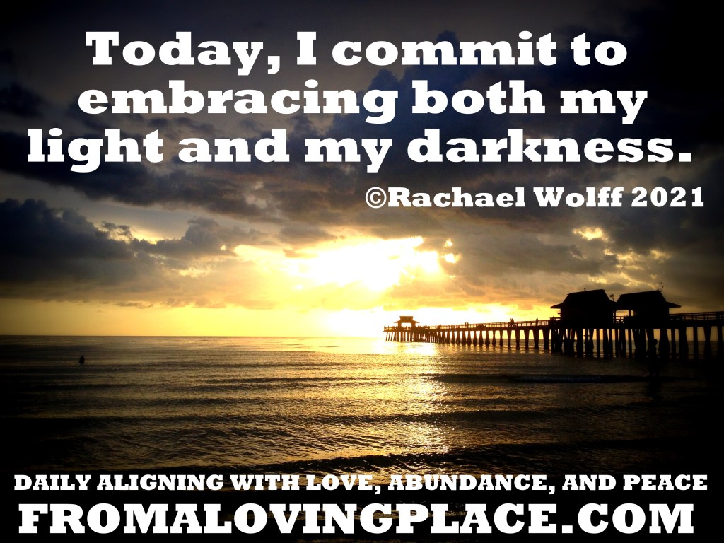 Today, I commit to embracing both my light and my darkness. Anytime I’m in the energy of fear, lack, and separation, I’m in my darkness. The question is whether I’m consciously there or unconsciously there. If I can question my thinkings, observe how the energy feels in my body, and be open to what it is there to show me, I’m consciously there. If I’m just judging, shaming, gossiping, blaming, raging, hating, etc., I’m in my darkness unconsciously. Sometimes, I realize after the fact that I was in my darkness and can look at consciously to see where, why, and how my energy slipped into my darkness unknowingly. I don’t beat myself up for doing it, I just use the information to choose better next time. I’ve learned so much about myself from both the conscious and unconscious trips into my own darkness. Seeing and embracing my own darkness helps me find compassion for other people who get stuck and/or lost in theirs.