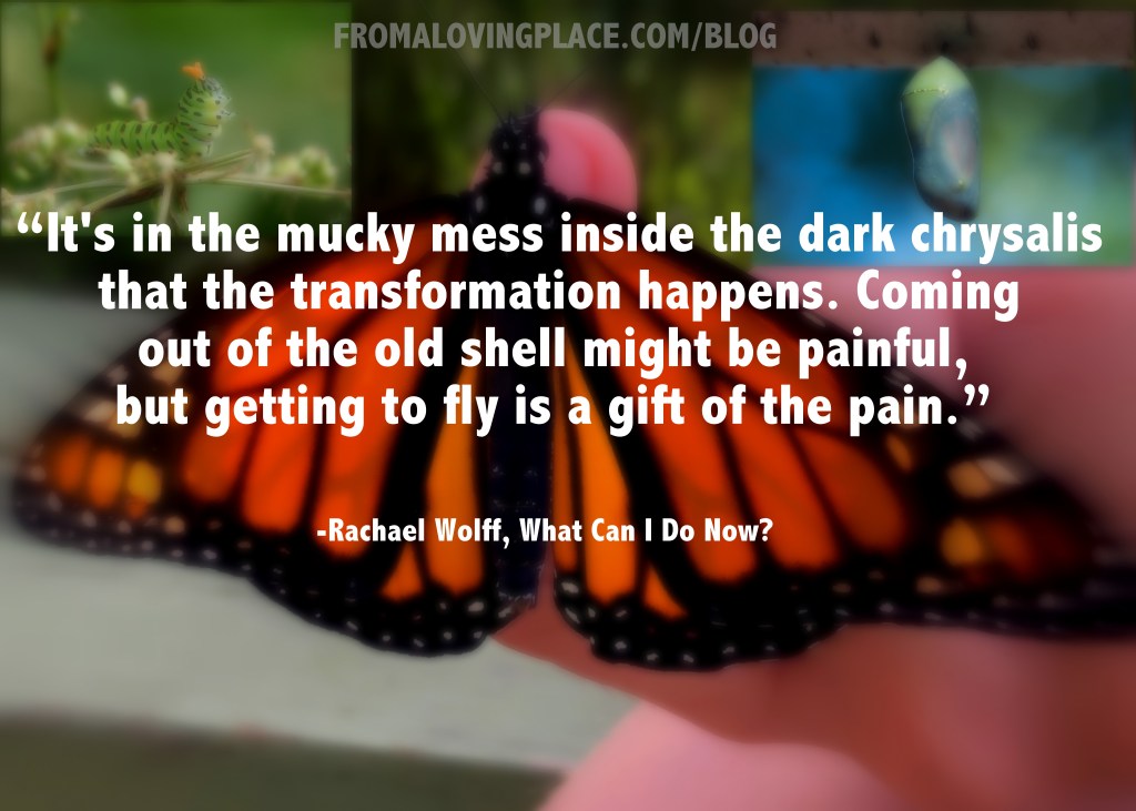 I know I’m not meant to feel joy every moment of every day, because it’s those times when I don’t that I open myself up for crazy amounts of growth. Experiencing joy is me celebrating my growth. Growth may be painful, but it’s worth it. I always love the image of caterpillars coming a part, then finding new ways to come back together before they get their wings. It in the mucky mess inside the dark chrysalis that the transformation happens. Coming out of the old shell might be painful, but getting to fly is a gift of the pain. This visualization is just my reminder of my truth that wherever I am in any moment is okay.